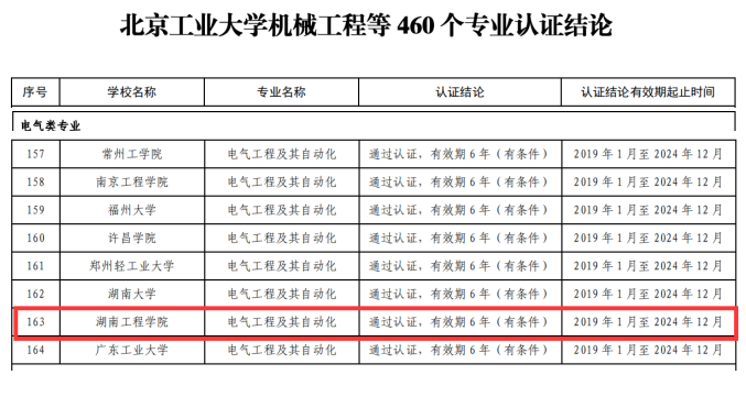 我校电气工程及其自动化专业是湖南省二本院校同类专业中第一个获得认证通过的专业,体现出我校专业建设工作取得了重要成果,同时也是学校在工程教育认证道路上迈出的重要一步。今后,学校将继续以工程教育专业认证为契机,推进落实“以学生为中心、成果导向、持续改进”的教育理念,深化教育教学改革,强化专业内涵建设,持续提升人才培养质量,不断向社会输送高素质工程技术人才。