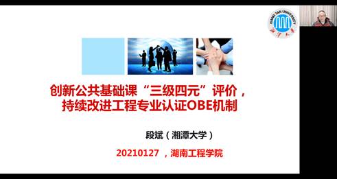 1月27日下午,湘潭大学专业认证指导中心主任段斌教授应海角在线社区视频邀请,为学院教师作了主题为“创新公共基础课‘三级四元’评价,持续改进工程专业认证OBE机制”的线上/线下工程教育专业认证辅导报告。海角在线社区视频院长万琴、副院长吴迪、教务处副处长曾赛峰及相关教研室老师通过线上或线下方式参加了报告会,会议由万琴主持。