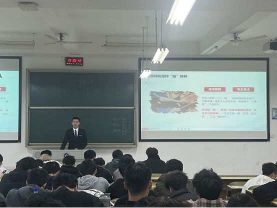 班会前各班制作宣传展板、手绘精美海报进行前期宣传,营造出浓厚的工匠精神氛围。班会中,主讲人从工匠精神的基本内涵、如何弘扬工匠精神等方面对工匠精神进行深入解读,通过展示各行各业的工匠精英事迹、观看《大国工匠》视频等,以实际案例引导同学们对“工匠精神”进行深刻了解,深刻感受匠人身上追求卓越的精神品质,坚定了同学们争做当代优秀大学生的使命担当。