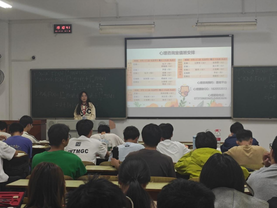 随后,各班级主持人介绍了心理健康教育与咨询中心地址、咨询预约电话、各校区心理咨询室地址和值班时间、易班APP上的心理咨询预约方法,宣传了“湖南工程学院学工在线”微信公众号。