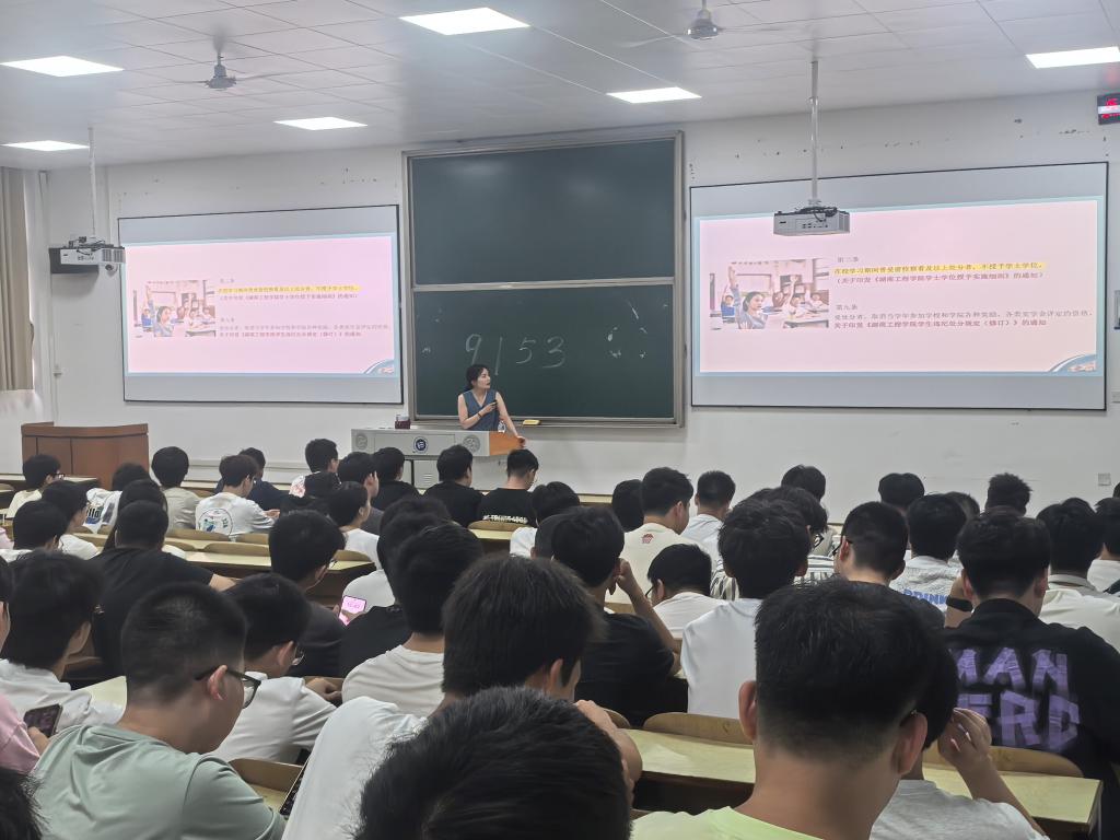 在学风建设部分,新生辅导员吕思凡着重强调“学风是学院发展的立院之本”,详细解读《湖南工程学院课程考核管理规定》,明确要求新生严格遵守课堂纪律,坚决杜绝迟到、早退、旷课等不良行为,坚守诚信考试的底线。