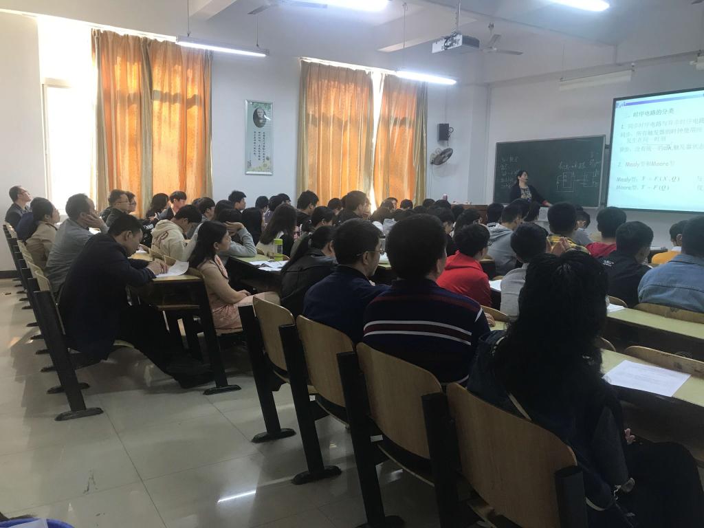 李立教授主讲的《时序逻辑电路》章节,围绕时序逻辑电路的分析方法、时序逻辑电路的设计方法、时序逻辑集成电路展开,采用传统板书与现代多媒体相结合的方式,板书整洁有序,课前准备充分,教学内容层层递进,知识点之间逻辑严密,展现出了扎实的教学功底。李立教授还走下讲台,走到学生中间,利用超星学习通软件,穿插在课堂教学过程中,给出题目,让学生抢答,与学生展开了良性互动,活跃了课堂气氛,充分提升了学生参与课堂的积极性和主动性,取得了良好的教学效果。