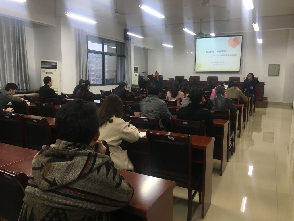 “为心护航,守护平安”,12月1日下午,海角在线社区视频在电气楼408举行班主任心理健康教育培训讲座,讲座由学生工作办公室主任赵玲令主讲,学院党委副书记李延平、全体辅导员、班主任参加。