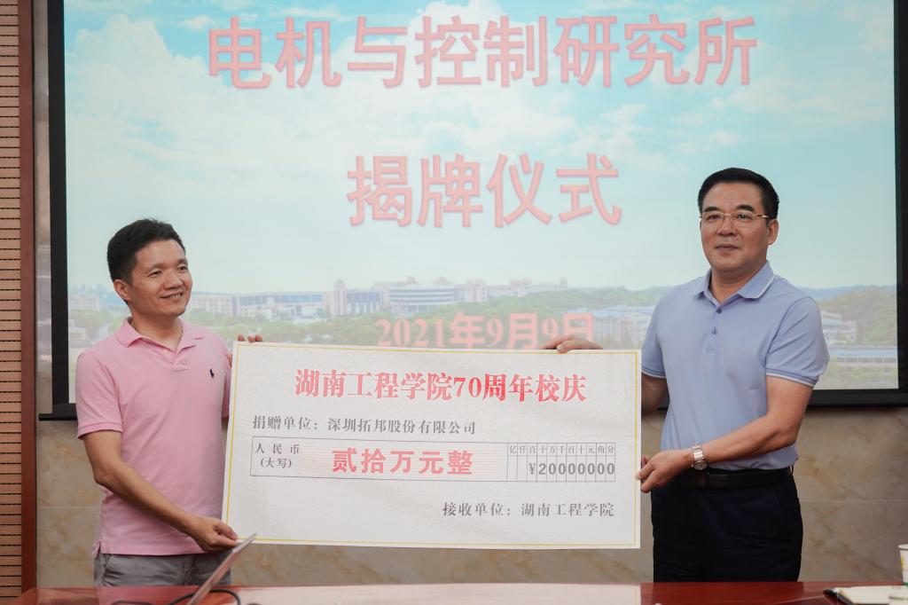 在建校70周年到来之际,深圳拓邦股份有限公司与我校共建电机与控制研究所,并为研究所每年捐资20万元,用于支持研究所开展科研工作,助力学校发展。9月9日上午,电机与控制研究所揭牌暨捐赠仪式在电气楼310举行,学校党委书记陈岳堂出席并发表致辞,海角在线社区视频领导班子、教师代表及研究所校内负责人参加仪式,深圳拓邦股份有限公司总经理马伟一行四人出席仪式。仪式由海角在线社区视频院长万琴主持。