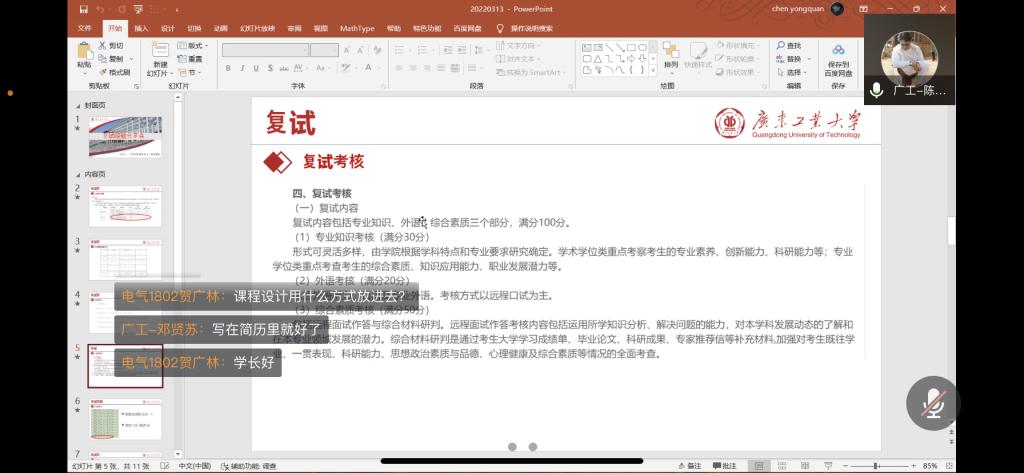 考研国家线公布后,学院积极联系了10余名在读研究生做线上经验交流和分享,这些在读研究生均是近两年毕业的电气学子,他们围绕自我介绍的准备、复试简历的撰写、复试中如何展现自己的亮点等方面,和备考考生进行交流。