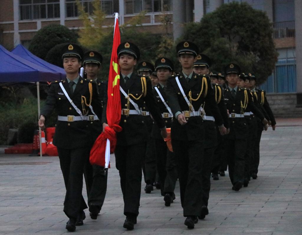 国旗护卫队迈着铿锵有力的步伐走向升旗台,伴随着雄壮的国歌声响起,升旗手把国旗向上抛撒,全体师生庄严肃立,齐唱国歌,注视着鲜艳的五星红旗缓缓升起。