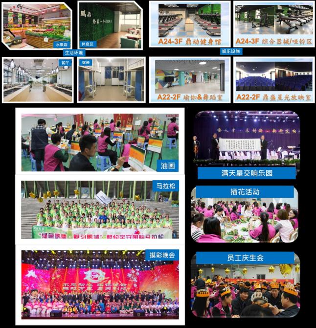 1. 提供多样化员工就餐服务,如面食馆、湘菜馆、台湾小吃店、水果店、超市、商业街 2. 提供 4 人/间宿舍,宿舍提供空调、独立书桌、柜子等,免费洗衣服务 3. 园区周边提供上下班交通服务 |